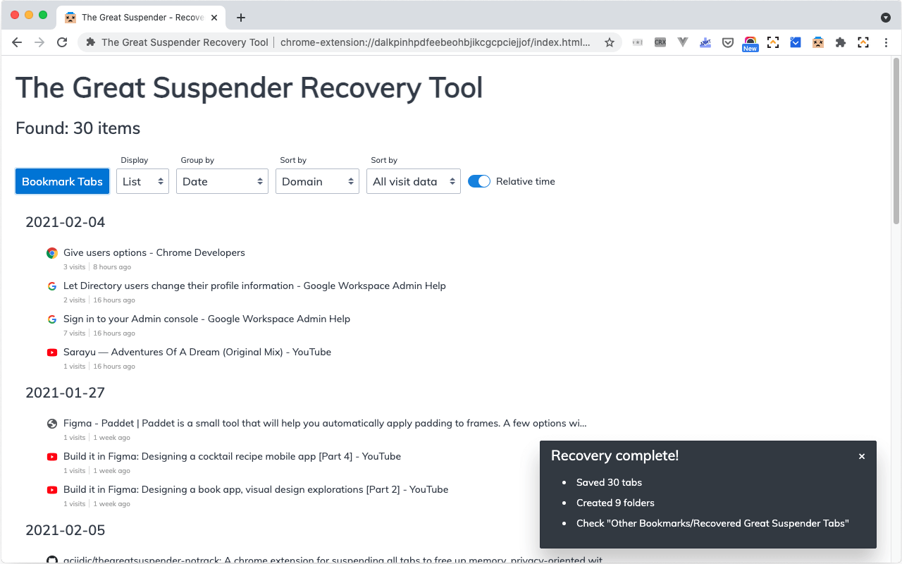 I responded by writing The Great Suspender Recovery Tool, another Chrome extension, in under 12 hours to attempt to recover users' suspended tabs by searching their browser history and displaying any recovered tabs.
